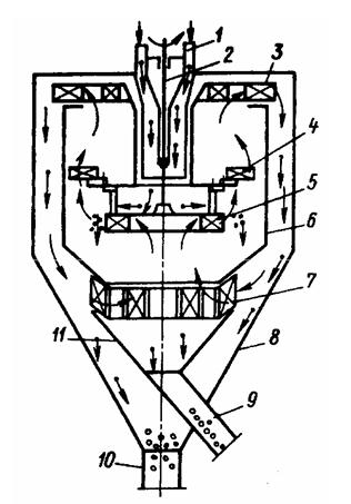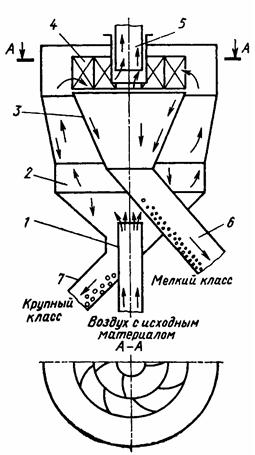 Проходной сепаратор (рисунок...) представляет собой статический аппарат, в котором материал разделяется только за счет энергии сжатого воздуха. Исходный материал вместе со сжатым воздухом поступает по патрубку 1 в корпус 2 сепаратора. Из-за расширения канала, по которому движется смесь, скорость потока уменьшается, и крупные частицы выпадают из смеси под действием сил тяжести. Воздушный поток с мелкими частицами проходит по направляющим лопастям 4 во внутренний корпус 3. В корпусе поток закручивается и из него под действием центробежных сил выпадают мелкие частицы. Крупные частицы выводятся из сепаратора по патрубку 7, мелкие - по трубе 6, а отработанный воздух направляется по трубе 5 в пылеочистительные аппараты. Граница разделения регулируется дросселированием потока воздуха и изменением угла установки направляющих лопастей 4.