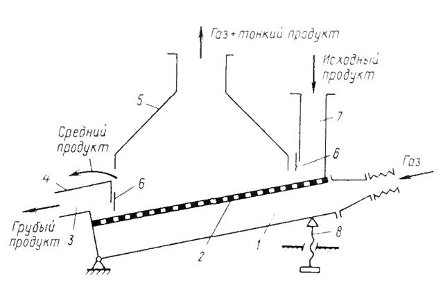 1 - газораспределителъ; 2 - газораспределительная решетка; 3 - патрубок вывода крупных фракций; 4 - патрубок вывода средних фракций; 5 - патрубок отсоса мелких фракций; 6 - заслонка; 7 - загрузочное устройство; 8 – устройство для регулировки угла наклона решетки