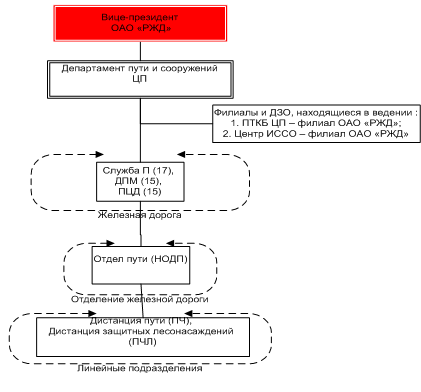 Структура ОАО РЖД: Железные дороги, Дирекция инфраструктуры, Дирекции управления движением, Дирекция тяги, Моторвагонная дирекция, Дирекция пригородных перевозок «Транском», Дирекция железнодорожных вокзалов, Дирекция скоростного сообщения, Центр фирменного транспортного обслуживания, Дирекции по управлению терминально-складским комплексом, «Росжелдорснаб», «Трансэнерго», Институт технико-экономических изысканий и проектирования железнодорожного транспорта «ГИПРОТРАНСТЭИ», Центр инновационного развития,Центр корпоративного учёта и отчётности «Желдоручет», Центр научно-технической информации и библиотек, Центр организации труда и проектирования экономических нормативов, Дирекция по комплексной реконструкции железных дорог и строительству объектов железнодорожного транспорта, Дирекция по ремонту тягового подвижного состава, Дирекция по эксплуатации и ремонту путевых машин, Дирекция по строительству сетей связи, Дирекция по ремонту грузовых вагонов (упразднена с 01.07.2011 г. путём преобразования в три вагоноремонтные компании (ВРК-1, ВРК-2, ВРК-3)), Дирекция по ремонту пути, Дирекция по тепловодоснабжению, «Трансинформ», Главный вычислительный центр, Центральная станция связи, Центр обследования и диагностики инженерных сооружений, Дирекция социальной сферы, Дирекция медицинского обеспечения, Научные институты и проектные организации