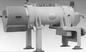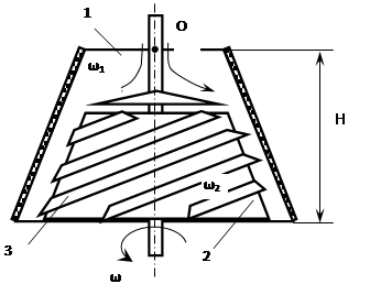 Питание подается в пространство между фильтрующим и шнековым ротором, снабженным винтовыми скребками. Фильтрующий ротор имеет перфорированные стенки. Оба ротора вращаются в одном и том же направлении, но с различной скоростью. Скорость фильтрующего ротора на 3% больше: ω1 > ω2 .