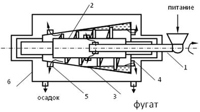 1 - питающая труба, 2 – шнековый ротор, 3 - осадительный ротор, 4 – сливные окна для удаления фугата, 5 – окна для выгрузки осадка, 6 – кожух.