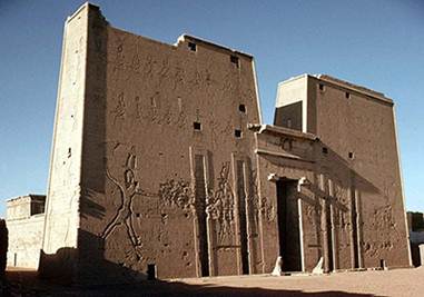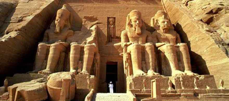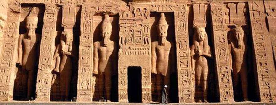 В ознаменование своей победы над хеттами Рамзес II построил скальный храм в Абу-Симбеле, в Нубии. Плоскостям фасадов придана трапециевидная форма пилонов. На их фоне из того же скального массива изваяны четыре гигантские статуи. Фараону покровительствовали три божества - Амон, Ра и Пта, поэтому он повелел изобразить их, а заодно и себя в фасадных 20-метровых изваяниях, придав ликам богов собственный образ. Взгляд изваяний устремлён на восток, навстречу солнцу, фигуры изображены в клафте со сдвоеной короной и уреем - священной коброй. У ног фараона - небольшие скульптуры, члены его многочисленной семьи: жены Нефертари, матери и нескольких детей.