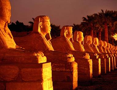 От могучего пилона Луксорского храма Амона-Ра к Карнакскому вела аллея сфинксов. Первоначально они были с головой барана - священного животного бога Амона, и телом льва. Во времена XX династии они были заменены сфинксами с человеческими головами. Эта аллея вскоре разделиласьна две: правая вела к храму Мут, а левая - к храму Хонсу. Луксорский храм таким образом оказывался включённым в Карнакский комплекс.