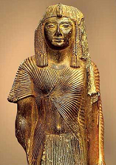 Ручки бронзовых зеркал украшены или головою божеств: Хатор - богини любви, Ахаутия - покровителя женщин, его брата Беса - патрона румян и декоративной косметики вообще, или же просто женской нагой фигурой, цветком папируса или лотоса. Превосходно отполированный диск этих ручных зеркал из бронзы отражал в себе смуглые лица египтянок не хуже наших стеклянных зеркал. На всех предметах этого времени лежит печать декоративности, характерной как для "большого" искусства, так и для малой пластики.
