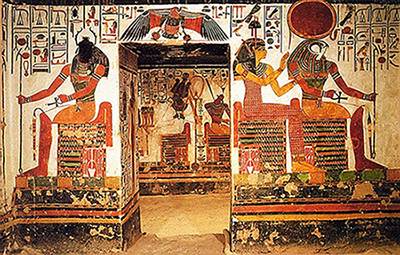 С начала Нового царства царские гробницы окончательно отделяются от заупокойных храмов. Усыпальницы стали устраиваться в ущельях и скалах. Они представляют собой тщательно скрытые тайники. Стены помещений расписаны сценами, относящимися главным образом к заупокойному культу.