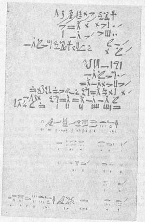 3. Источником большей части наших сведений об египетской математике являются два математических папируса. Один из них – это уже упомянутый папирус Райнда, содержащий 84 задачи, второй – так называемый московский папирус, который, может быть, на два столетия старше и содержит 25 задач. Эти задачи были уже достаточно