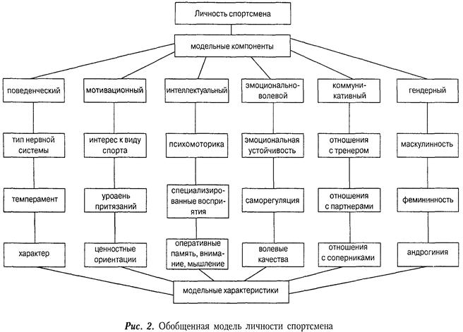 Модель личности спортсмена (рис. 3) состоит из шести основных структурных компонентов, показывающих основные направления исследования личности спортсмена: поведенческий, мотивационный, интеллектуальный, эмоционально-волевой, коммуникативный, гендерный. Каждый из компонентов, в свою очередь, имеет по три модельные характеристики, представляющие конкретные психологические качества.