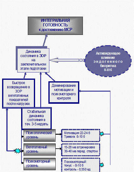 1. Стабильная динамика психофизиологических параметров на психологическом, вегетативном и психомоторном уровнях состояния в течение 3-5 недель этапа заключительной подготовки в следующих актуальных оптимальных зонах реагирования(ЗОР):