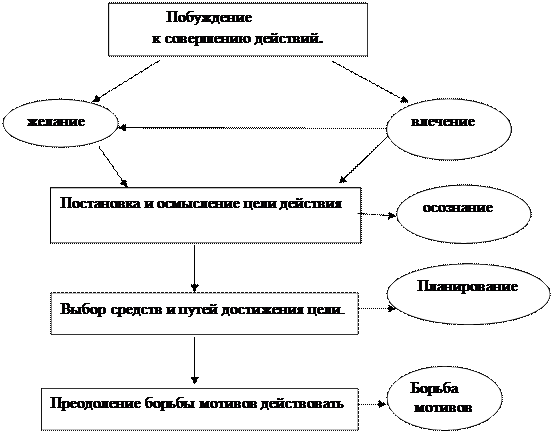 Будучи сложными сознательными актами, имеющими конкретную психологическую структуру, волевые действия начинаются с осознанием цели действия и связанного с ней мотива (рисунок 9).
