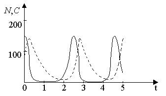 r=5, а' = 0,1, q = 2, f = 0,6, N0 = 150, C0 = 50. Сплошная линия – численность жертвы,штриховая–хищника