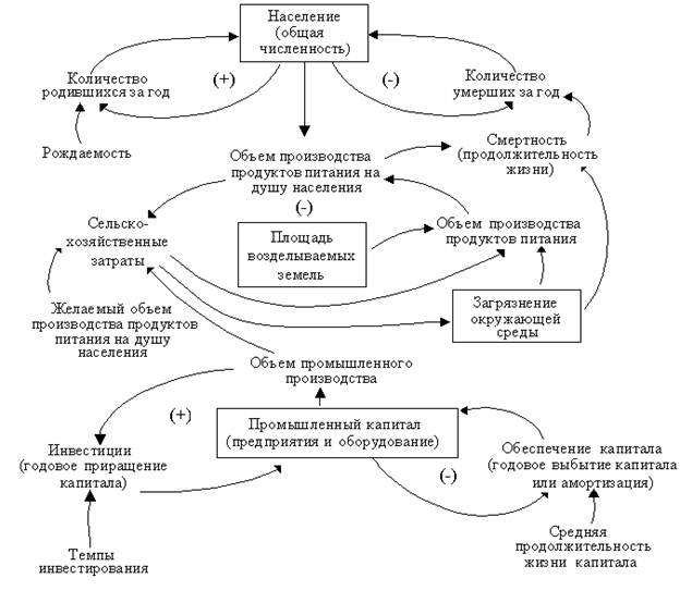 Рис. 12. Контуры обратных связей численности населения, капитала, сельскохозяйственного производства и загрязнения окружающей среды