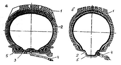 Рис. 1. Камерные шины грузовых (а) и легковых автомобилей (б) (разрез): I -покрышка; 2 - ездовая камера. 3 - ободная лента; 4 - вентиль; 5 - обод