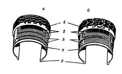 Рис. 3. Покрышки диагональной (а) и радиальной (б) конструкции (разрез): 1 - протектор; 2 - слой брекера; 3 - слой каркаса; 4 - резиновая прослойка каркаса; 5 - бортовая часть