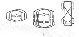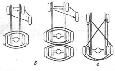 Рис. 10. Перестановка шин: в - по оси; г- на троллейбусе; д - на прицепах и полуприцепах.