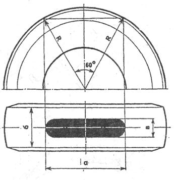 Рис. 11. Зона предельного износа рисунка протектора (затемнена). Ширина зоны "в" должна быть равна половине ширины беговой дорожки "б", т.е. в= 0,5 б. Длина зоны "а" должна быть равна 1/6 длины окружности, т.е. а=2pR/6, где R - свободный радиус шины (1/6 длины окружности равна длине дуги, хорда которой равна радиусу).