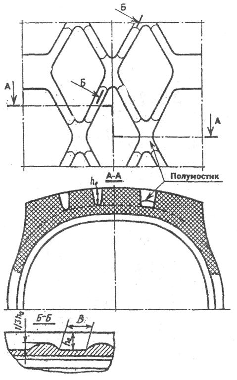 Рис. 13. Универсальный рисунок протектора с полумостиками в местах пересечения канавок. Высота полумостиков составляет около 1/3 высоты рисунка протектора новой шины (h0 в сечении Б-Б). "В" - зона замера остаточной высоты выступов рисунка протектора.