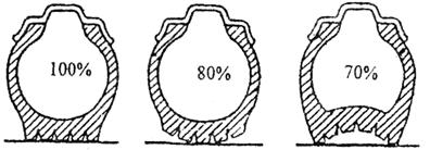 Рис. 14. Вид деформации и использование ресурса шин (в °/о): а- при нормальном давлении воздуха; б - при давлении, повышенном на 20 %; в - при давлении, сниженном на 20 %.