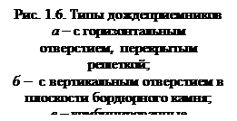 В зависимости от конструкции верхней (принимающей сточные воды) части дождеприемники бывает трех типов: с горизонтальным отверстием, перекрытым решеткой; с вертикальным отверстием в плоскости бордюрного камня; комбинированные (рис. 1.6).