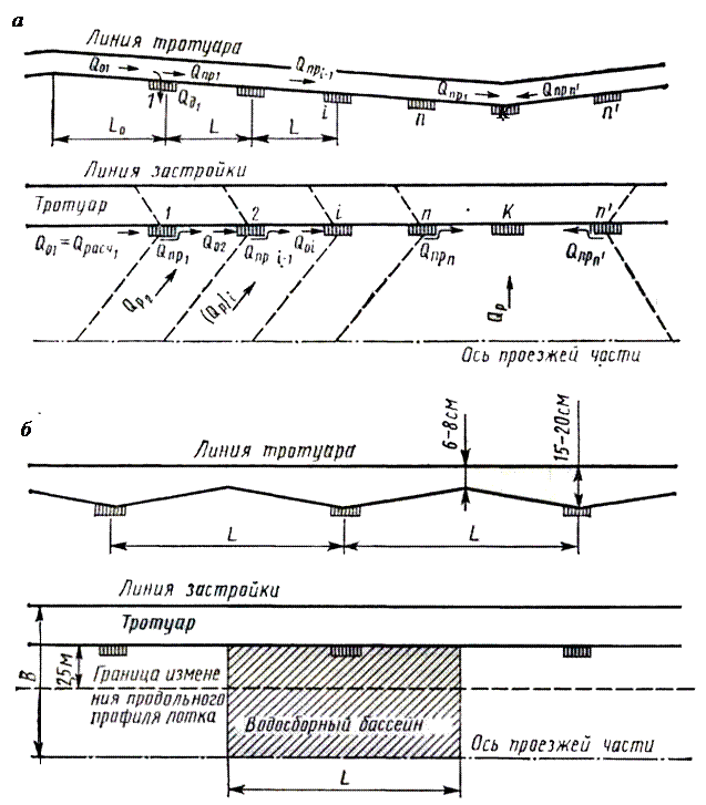 При установке дождеприемников в пониженных местах лотков с пилообразным продольным профилем (рис. 1.8, б) расход в лотке перед каждым из таких дождеприемников равен расчетному расходу дождевых вод сплощади водосбора (водосборного бассейна) и целиком принимается дождеприемником.