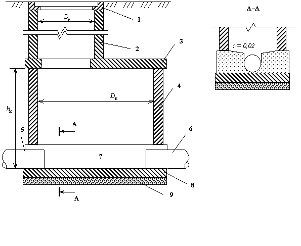 Лоток в колодце делается из бетона, в нижней части он полукруглый, в верхней – имеет вертикальные стенки. С двух сторон лотка создаются полки с уклоном к центру. Рабочая камера должна иметь следующие минимальные размеры: высота hк – 1,8 м, диаметр Dк – 1,0 м. Минимальный диаметр горловины Dг – 0,7 м. Рабочие камеры и горловины оборудуются скобами или лестницами для спуска или подъема. Стенки рабочих камер и горловин могут выполняться из типовых железобетонных элементов – колец и плит.