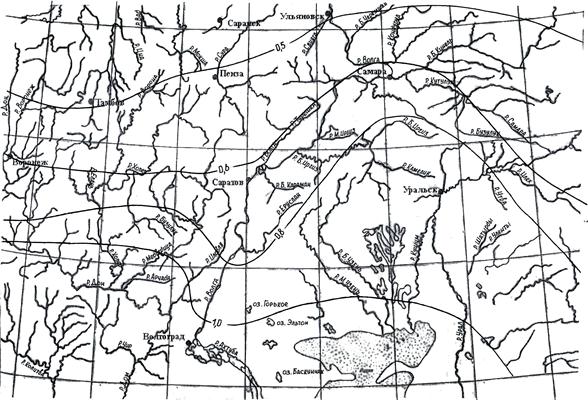 Для приближенных расчетов средний многолетний слой талых вод с водосборных бассейнов площадью F > 100 км2 может быть принят по карте изолиний (рис. 2.9). Для малых бассейнов (F < 100 км2) вводятся поправочные коэффициенты: 1,1 – при холмистом рельефе и глинистых почвах; 0,9 – при равнинном рельефе и песчаных почвах; 0,5 – при особо больших потерях стока (сосновый лес на песках).