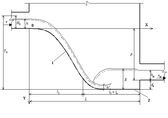 Гидравлический расчет перепадов с водосливом практического профиля производится по формулам гидравлики для сопряжения бьефов и сводится к определению длины водобойной части lк = l 2, глубины водобойного колодца dк и координат водосливной поверхности x и y (см. рис. 3.3).