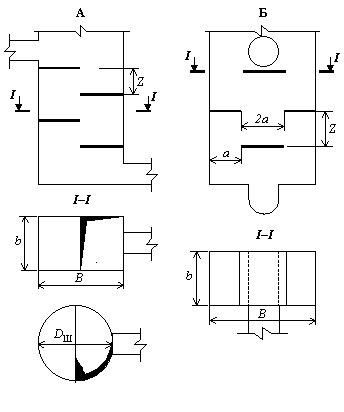 где q = Q / DШ (или q = Q / b) – удельный расход, м3/с; DШ – диаметр ствола шахты (для круглого сечения), м; b – ширина шахты (для прямоугольного сечения), м; KI и KJ – коэффициенты, зависящие от относительного шага ступеней z/B или z/DШ.