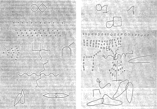 Рис. 3.3. Гештальт-тест Бендера (The Bender Gestalt Test). В процессе данного теста испытуемые копируют на листке бумаги каждый из 9 рисунков, а затем рисуют их вновь по памяти. Значительные ошибки в рисунке (как это видно справа на рисунке, сделанном человеком с повреждением мозга) могут отражать некие органические дисфункции мозга. (Взято из книги Lacks, 1984, р. 33.)