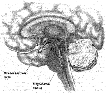 Рисунок 5.2. Биология паники. Голубоватое пятно посылает сигналы миндалине, области мозга, которая, как известно, приводит в действие эмоциональные реакции. Многие нейроны в голубоватом пятне используют норэпинефрин, медиатор, связанный с паническим расстройством и депрессией.