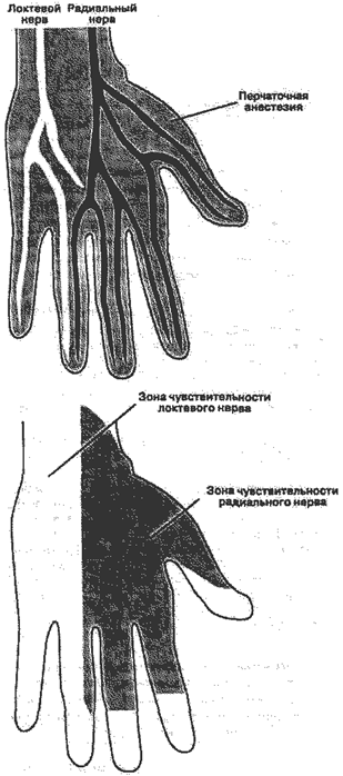 Рисунок 8.1. Перчаточная анестезия. При этом конверсионном симптоме немеет вся кисть руки, от кончиков пальцев до запястья. Настоящее заболевание или повреждение локтевого нерва может вызвать потерю чувствительности в безымянном пальце и мизинце и в части руки выше запястья; заболевание или повреждение радиального нерва вызывает потерю чувствительности в большом, указательном, среднем и частично в безымянном пальцах, и далее вверх по руке (Gray, 1959).