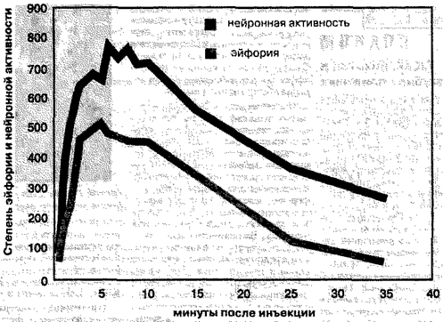 Рисунок 10.1. Биохимическая эйфория. Субъективные ощущения состояния эйфории после инъекции кокаина почти совпадают с теми, которые человек испытывает, когда на его нейроны воздействуют дофамины. Состояние эйфории достигает максимума приблизительно в то же самое время, что и нейронная активность (Fowler, Volkow & Wolf, 1994, p. 110; Cook, Jeffcoat & Perez- Reyes, 1985).