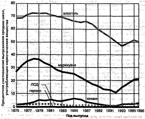 Рисунок 10.2. Подростки и употребление психоактивных веществ. Общее процентное соотношение выпускников средних школ, которые признались в том, что нелегально употребляли наркотические вещества, по крайней мере, один раз за 30-дневный период проводимых исследований, возросло в 70-е годы, уменьшилось в 80-е и вновь возросло в 90-е годы (NIDA, 1996).