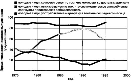Рисунок 10.3. Изменение тенденций. В 80-е годы наблюдался устойчивый рост процентного соотношения выпускников средних школ, считающих систематическое употребление марихуаны опасным, и, соответственно, наблюдалось устойчивое снижение процентного соотношения систематически употребляющих марихуану. Эта тенденция поменяла направленность в 90-е годы. Сегодня лишь немногие выпускники считают, что употребление марихуаны представляет собой опасность и гораздо большее число школьников употребляют ее. В любом случае наркотик остается очень доступным (NIDA, 1996).