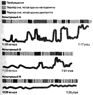 Рисунок 11.3. Измерение эрекций во время сна. Испытуемый А, мужчина, не испытывающий проблем с эрекцией, у него возникают нормальные эрекции в тот период сна, когда зрачки у человека двигаются и он видит сновидение. У испытуемого Б есть проблемы с эрекцией, но вызваны они, по крайней мере отчасти, психогенными факторами — иначе этот мужчина не испытывал бы никаких эрекций во время периода быстрого сна. Проблемы с эрекцией у испытуемого В — органические, эта интерпретация подтверждается отсутствием эрекции во время сна. (Adapted from Bankroft, 1985.)