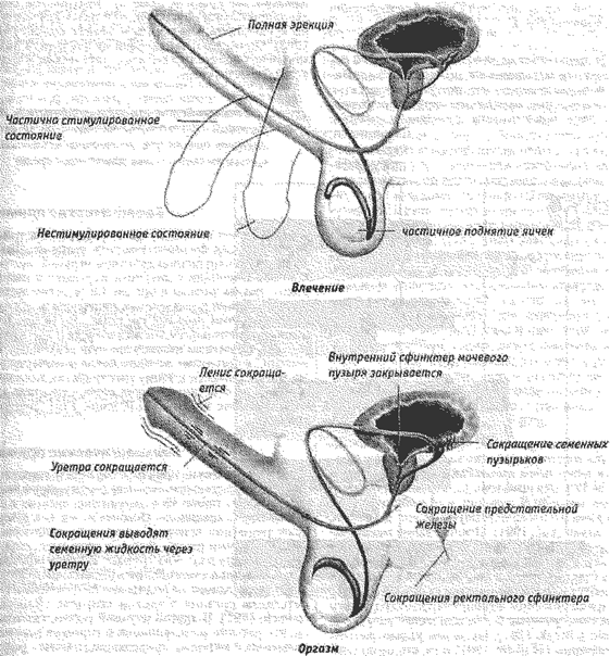 Рисунок 11.4. Нормальная структура мужских половых органов. Во время каждой фазы цикла сексуального реагирования происходят изменения в мужских половых органах. (Adapted from Hyde, 1990, p. 199.)