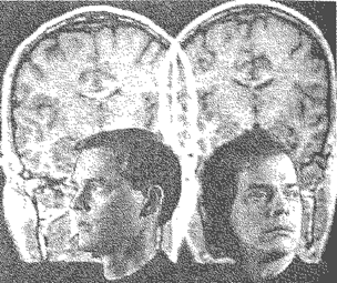 Не совсем идентичные близнецы. Человек слева нормален, в то время как его однояйцевый близнец, справа, болен шизофренией. Томограмма, полученная с помощью ядерного магнитно-резонансного сканирования (на заднем плане), демонстрирует, что мозг больного шизофренией в целом меньше, чем мозг его брата, и имеет расширенные желудочки, показанные темным пространством в форме бабочки.