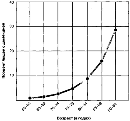 Рисунок 13.2. Деменция и возраст. Распространенность деменции тесно связана с возрастом. Деменцией страдает менее 1% всех 60-летних, в сравнении с 29% тех, кому 90. После 60 лет частота деменции удваивается каждые шесть лет вплоть до 90-летнего возраста; затем этот рост уменьшается. (Ritchie et al., 1992.)