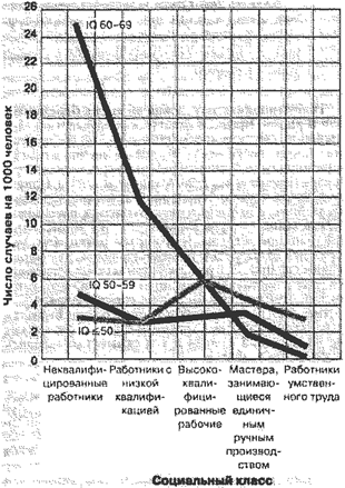 Рисунок 15.4. Умственная отсталость и социально-экономическое положение. Легкая форма умственной отсталости намного чаще встречается в низших социоэкономических классах. Однако более серьезные виды умственной отсталости, приводящие к большему ухудшению функционирования, распределяются равномернее. (Popper, 1988; Birch et al., 1970.)