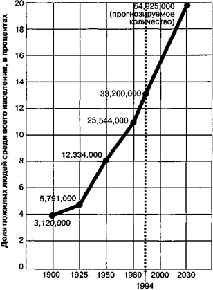 Рисунок 15.5. На подъеме. Количество людей старше 65 лет в Соединенных Штатах в течение XX века увеличилось в 11 раз. Доля пожилых людей среди населения увеличилась с 4% в 1900 году до 12,5% в 1994 году, а в 2030 году, согласно прогнозам, достигнет 20% (Hobbs, 1997; AARP, 1990).