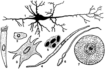 1 — нервная; 2 — эпителиальная; 3 — соединителытотканная; 4 — гладкая мышечная; 5— эритроцит; 6— сперматозоид; 7—яйцеклетка