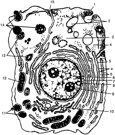 1 — цитолемма (плазматическая мембрана); 2 — пиноцитозные пузырьки; 3 — центросома (клеточный центр, цитоцентр); 4 — гиалоплазма; 5 — эн-доплазматическая сеть (о — мембраны эндоплазматической сети, б — ри-босомы); 6— ядро; 7— связь перинуклеарного пространства с полостями эндоплазматической сети; 8 — ядерные поры; 9 — ядрышко; 10 — внутриклеточный сетчатый аппарат (комплекс Гольджи); 77-^ секреторные вакуоли; 12— митохондрии; 7J — лизосомы; 74—три последовательные стадии фагоцитоза; 75 — связь клеточной оболочки (цитолеммы) с мембранами эндоплазматической сети