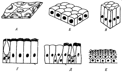 А — однослойный плоский; Б — однослойный кубический; В — цилиндрический; Г—однослойный реснитчатый; Д—многорадный; Е —многослойный ороговевающий