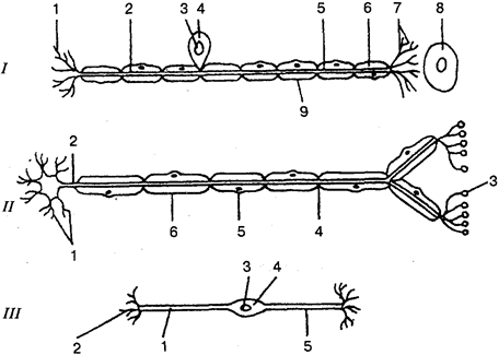 I — сенсорный нейрон: 1 — окончания нейрона; 2 — аксон; 3 — ядро; 4 — тело клетки; 5— дендрит; 6 — миелиновая оболочка; 7—рецептор; 8— орган; 9— неврилемма; II— двигательный нейрон: 1 — дендриты; 2— аксон; 3 — концевая бляшка; 4 — перехват Ранвье; 5 — ядро шванновской клетки; 6 — шванновская клетка; III — вставочный нейрон: 1 — аксон; 2 — дендриты; 3 — ядро; 4 — тело клетки; 5 — дендрон