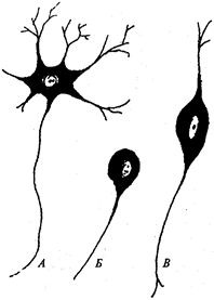 Нейроны — функциональные единицы нервной системы, которые имеют множество связей. Они чувствительны к раздражению, способны передавать электрические импульсы от периферических рецепторов к органам-исполнителям (рис. 7). Нервные клетки отличаются по форме, размерам и разветвленности отростков. Нейроны с одним отростком называются униполярными, с двумя — биполярными, с тремя и более — мультиполярными (рис. 8).