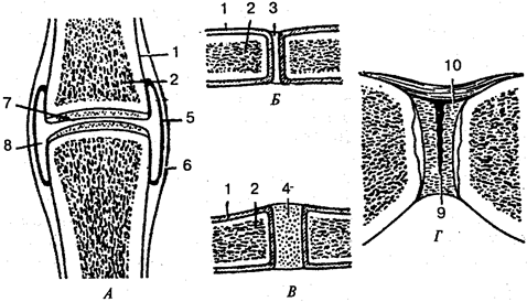 А — сустав; Б — фиброзное соединение; В — синхондроз (хрящевое соединение); Г— симфиз (гемиартроз); 1 — надкостница; 2— кость; 3— волокнистая соединительная ткань; 4 — хрящ; 5 — синовиальная мембрана; 6 — фиброзная мембрана; 7 — суставной хрящ; 8 — суставная полость; 9 — щель в межлобковом диске; 10— межлобковый диск