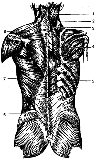 1 — ременная мышца головы; 2 — мышца, поднимающая лопатку; J — малая ромбовидная мышца; 4 — большая ромбовидная мышца; 5 — нижняя задняя зубчатая мышца; 6— поясничнр-фудная фасция; 7 - широчайшая мышца спины; 8 —трапециевидная мышца
