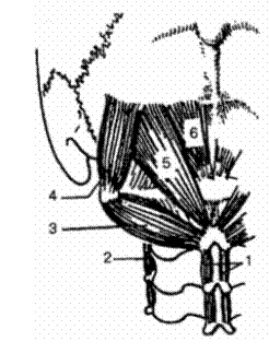 1—межостистые мышцы шеи; 2— межпоперечные мышцы; 3 — нижняя косая мышца головы; 4— верхняя косая мышца головы; 5— большая задняя прямая мышца головы; 6 — малая задняя прямая мышца головы