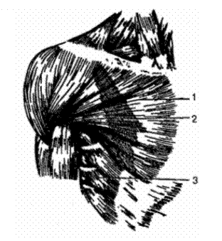1 — большая грудная мышца; 2 — малая грудная мыппа (контуры мышцы); 3 — передняя зубчатая мышца