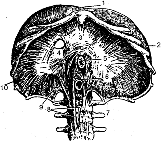 1 — грудчнная часть диафрагмы; 2, 10— реберная часть диафрагмы; 3 — сухожильный центр; 4 — отверстие для нижней полой вены; 5 — отверстие для пищевода; 6— отверстие для аорты; 7, 8, 9 — ножки поясничной части диафрагмы