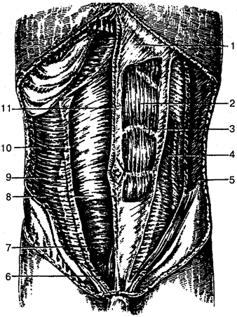 1 — апоневроз наружной косой мышцы живота; 2 — прямая мышца живота; 3 — сухожильная перемычка; 4 — внутренняя косая мышца живота; 5 — наружная косая мышца живота; 6— пирамидальная мышца; 7, 8— задняя стенка влагалища прямой мышцы живота; 9— апоневроз поперечной мышцы живота; 10 — поперечная мышца живота; 11— белая линия живота